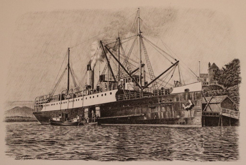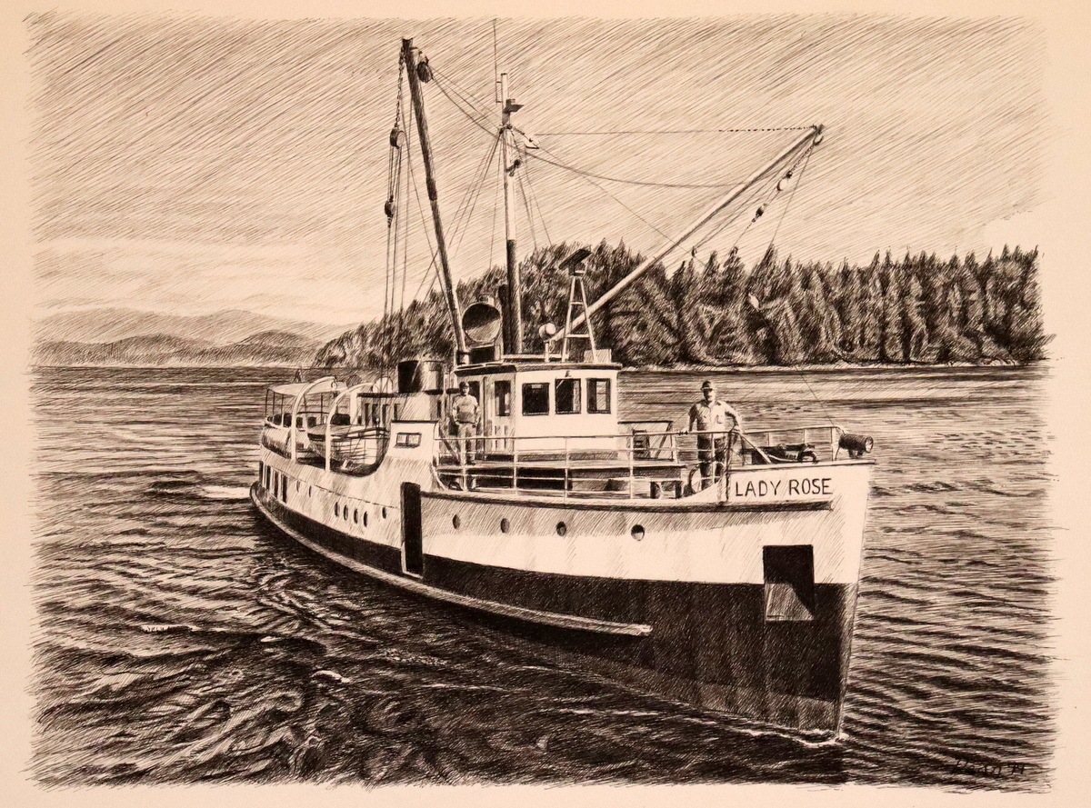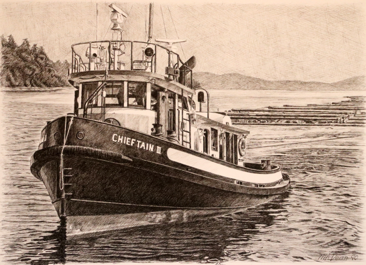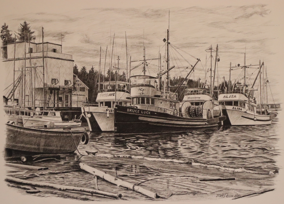 “Bruce Luck at Port Hardy“ – original pen and ink, 18″ x 12″, $795